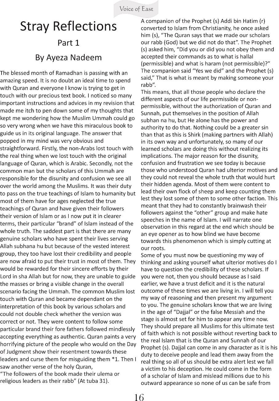 Stray Reflections – Part 1 By Editor on 19th October 2013 • ( 0 ) Stray Reflections By Ayeza Nadeem Discover more from Voice of East Subscribe to get the latest posts sent to your email. Type your email… Subscribe Share this:Tweet Click to share on Telegram (Opens in new window) Telegram Click to share on Mastodon (Opens in new window) Mastodon Click to share on Bluesky (Opens in new window) Bluesky Click to share on Threads (Opens in new window) Threads Click to share on Reddit (Opens in new window) Reddit Click to share on Nextdoor (Opens in new window) Nextdoor Pocket Click to share on WhatsApp (Opens in new window) WhatsApp Share on Tumblr Click to email a link to a friend (Opens in new window) Email Like Loading...‹ Pakistan – The Dar-e-Arqam and Madina of the Coming Daysپاکستان کے گرد گھیرا تنگ ہو رہا ہے ›Categories: History, Islam, OpinionTags: History, Muslim Ummah, Muslims Related Articles میں مارکسی نہیں محمدی ؐہوں فرقہ بندی ہے کہیں اور کہیں ذاتیں ہیں عربی اور عجمی کی تفریق دفاع از حرمتِ رسول اللہ ﷺ