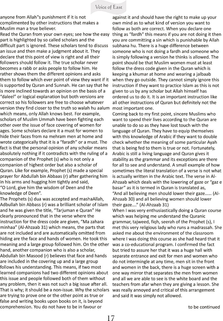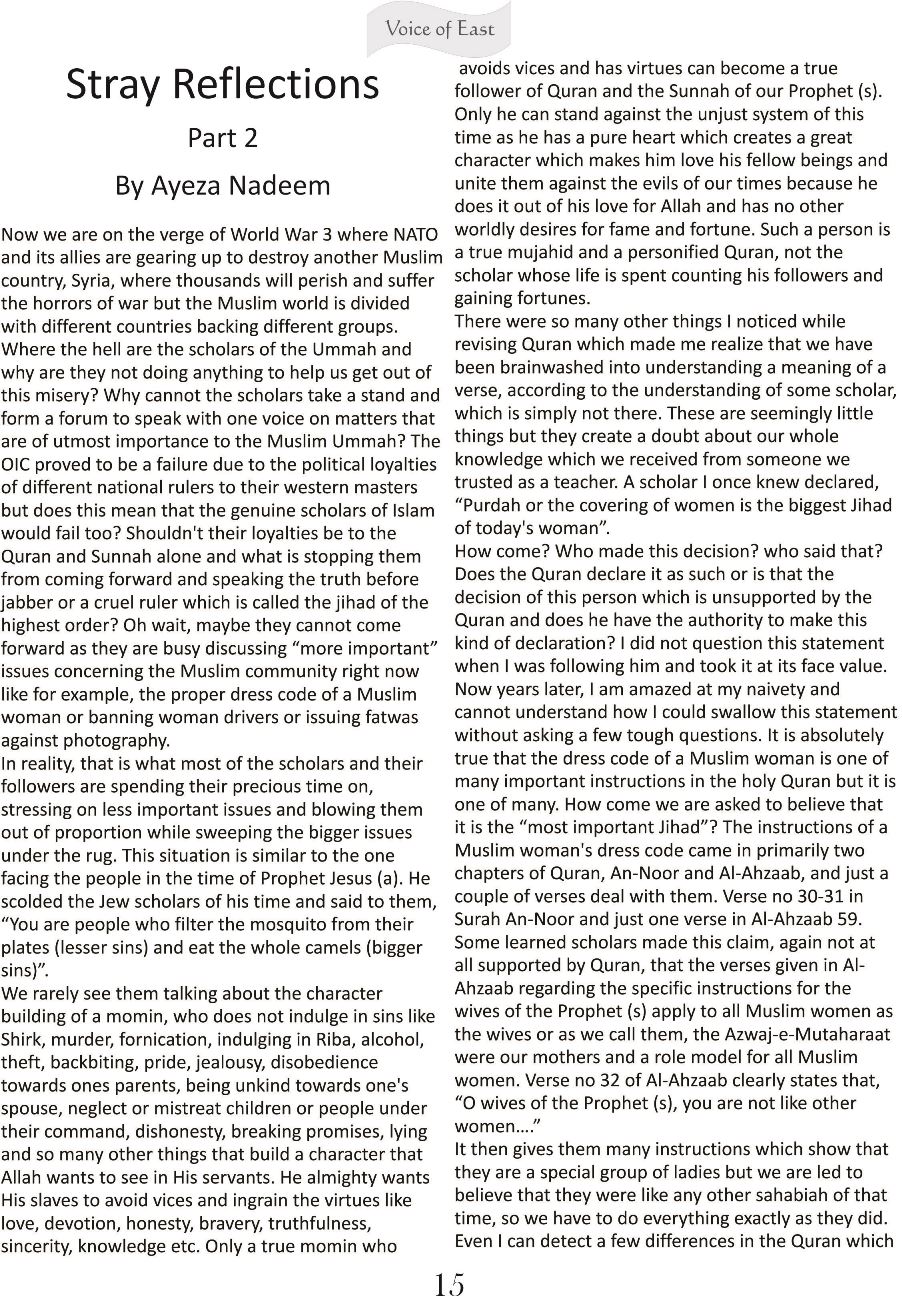 Stray Reflections – Part 2 By Editor on 17th November 2013 • ( 0 ) Stray Reflections – Part 2 By Ayeza Nadeem Discover more from Voice of East Subscribe to get the latest posts sent to your email. Type your email… Subscribe Share this:Tweet Click to share on Telegram (Opens in new window) Telegram Click to share on Mastodon (Opens in new window) Mastodon Click to share on Bluesky (Opens in new window) Bluesky Click to share on Threads (Opens in new window) Threads Click to share on Reddit (Opens in new window) Reddit Click to share on Nextdoor (Opens in new window) Nextdoor Pocket Click to share on WhatsApp (Opens in new window) WhatsApp Share on Tumblr Click to email a link to a friend (Opens in new window) Email Like Loading...‹ اسلامی فوج کے اسلامی ہتھیارThe Security Situation of Interior Sindh ›Categories: History, Islam, OpinionTags: Hijab, History, Muslim Ummah, Muslims, Niqab, Quran, Spirituality Related Articles میں مارکسی نہیں محمدی ؐہوں فرقہ بندی ہے کہیں اور کہیں ذاتیں ہیں عربی اور عجمی کی تفریق دفاع از حرمتِ رسول اللہ ﷺ