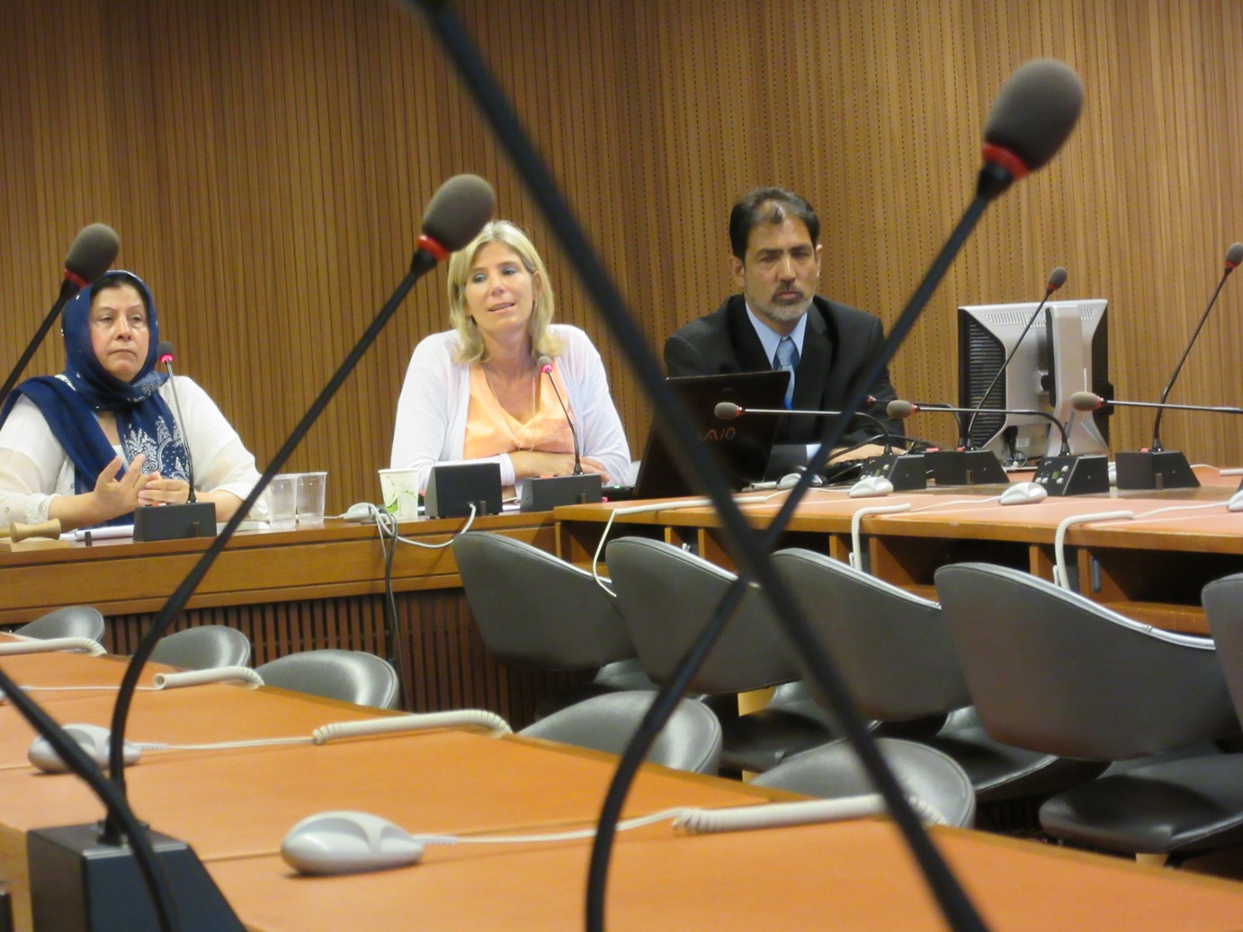 Altaf Hussain Wani, Mrs. Shamim Shawl and Daniela Donges speak at a major Kashmir event at UN in Geneva on Tuesday, where two Kashmiri women activists from Srinagar spoke to UN delegates.
