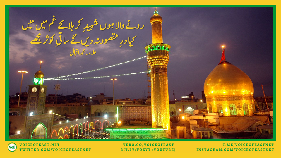 Iqbal’s intense love for and faith in Imam Hussain is apparent from this couplet. Fondly addressing the breeze that proverbially carries the message of the lover to the beloved who is at a remote place. Iqbal asks her to carry his tears to the sacred tomb of Imam Hussain. Dr Iqbal weeps in sad and blessed memory of Imam Hussain and wishes to place his tears over his Imam’s grave.