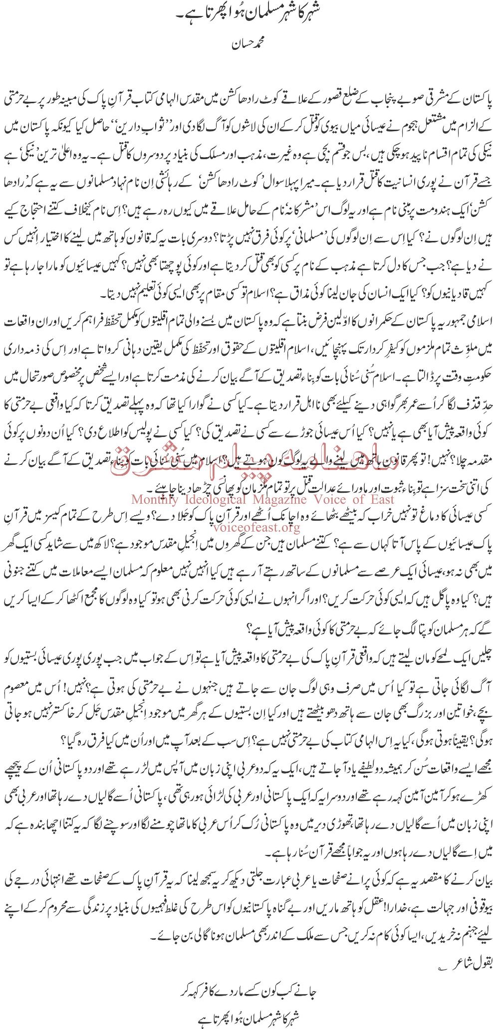 شہر کا شہر مسلمان ہوا پھرتا ہے By Editor on 22nd November 2014 شہر کا شہر مسلمان ہوا پھرتا ہے محمد حسان Discover more from Voice of East Subscribe to get the latest posts sent to your email. Type your email… Subscribe Share this:Tweet Click to share on Telegram (Opens in new window) Telegram Click to share on Mastodon (Opens in new window) Mastodon Click to share on Bluesky (Opens in new window) Bluesky Click to share on Threads (Opens in new window) Threads Click to share on Reddit (Opens in new window) Reddit Click to share on Nextdoor (Opens in new window) Nextdoor Pocket Click to share on WhatsApp (Opens in new window) WhatsApp Share on Tumblr Click to email a link to a friend (Opens in new window) Email Like Loading...‹ بھارتی جارحیت اور حکومت پاکستان کا “مثالی صبر” ۔فاروق اور ابو جہل ›Categories: Islam, OpinionTags: Minorities, Muslims, پاکستان, اردو, اسلام Related Articles Islamic Theology: Where Faith Meets Reason And Science ابو ظہبی کی لڑکیوں کا رقصِ زُلف The Ignoble Dance Of Tresses By The Girls Of UAE ڈاکٹر ذاکر نائیک کا عقیدہ