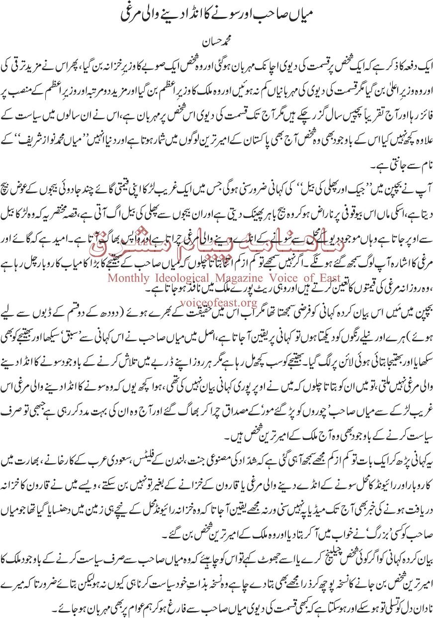 میاں صاحب اور سونے کا انڈہ دینے والی مرغی By Editor on 10th January 2015 میاں صاحب اور سونے کا انڈہ دینے والی مرغی محمد حسان Discover more from Voice of East Subscribe to get the latest posts sent to your email. Type your email… Subscribe Share this:Tweet Click to share on Telegram (Opens in new window) Telegram Click to share on Mastodon (Opens in new window) Mastodon Click to share on Bluesky (Opens in new window) Bluesky Click to share on Threads (Opens in new window) Threads Click to share on Reddit (Opens in new window) Reddit Click to share on Nextdoor (Opens in new window) Nextdoor Pocket Click to share on WhatsApp (Opens in new window) WhatsApp Share on Tumblr Click to email a link to a friend (Opens in new window) Email Like Loading...‹ Youth Forum For Kashmir’s Delegation Visits APS Peshawarتیرا وجود الکتاب ›Categories: Opinion, SatireTags: Nawaz Sharif, Pakistan, پاکستان, اردو