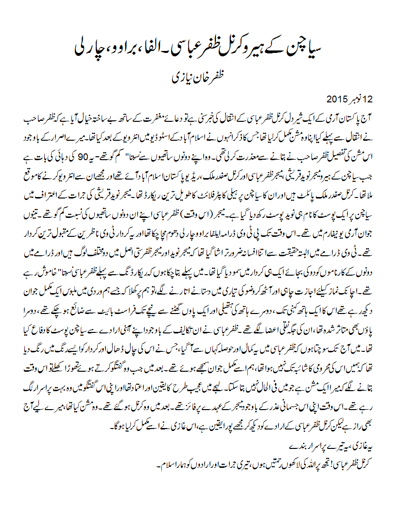 سیاچن کے ہیرو کرنل ظفر عباسی۔ الفا، براوو، چارلی