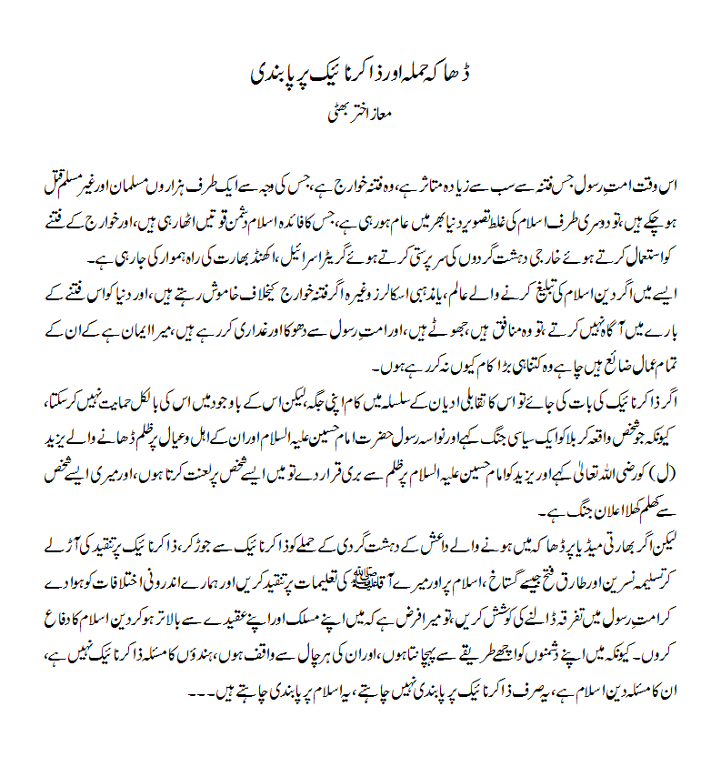ڈھاکہ حملہ اور ذاکر نائیک پر پابندی By Editor on 11th July 2016 • ( 0 ) ڈھاکہ حملہ اور ذاکر نائیک پر پابندی معاذ اختر بھٹی Discover more from Voice of East Subscribe to get the latest posts sent to your email. Type your email… Subscribe Share this:Tweet Click to share on Telegram (Opens in new window) Telegram Click to share on Mastodon (Opens in new window) Mastodon Click to share on Bluesky (Opens in new window) Bluesky Click to share on Threads (Opens in new window) Threads Click to share on Reddit (Opens in new window) Reddit Click to share on Nextdoor (Opens in new window) Nextdoor Pocket Click to share on WhatsApp (Opens in new window) WhatsApp Share on Tumblr Click to email a link to a friend (Opens in new window) Email Like Loading...‹ The Corporate Interests Of Pakistani Madrassas Vs Edhi’s PhilanthropyLast Three Years: A Turning Point In Pakistan’s Foreign Policy ›Categories: Islam, OpinionTags: اسلام, بھارت, ذاکر نائیک Related Articles Islamic Theology: Where Faith Meets Reason And Science ابو ظہبی کی لڑکیوں کا رقصِ زُلف The Ignoble Dance Of Tresses By The Girls Of UAE ڈاکٹر ذاکر نائیک کا عقیدہ