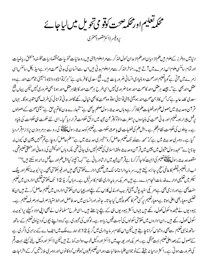 محکمہ تعلیم اور محکمہ صحت کو قومی تحویل میں لیا جائے By Editor on 5th September 2016 • ( 0 ) محکمہ تعلیم اور محکمہ صحت کو قومی تحویل میں لیا جائے پروفیسر ڈاکٹر مقصود جعفری Discover more from Voice of East Subscribe to get the latest posts sent to your email. Type your email… Subscribe Share this:Tweet Click to share on Telegram (Opens in new window) Telegram Click to share on Mastodon (Opens in new window) Mastodon Click to share on Bluesky (Opens in new window) Bluesky Click to share on Threads (Opens in new window) Threads Click to share on Reddit (Opens in new window) Reddit Click to share on Nextdoor (Opens in new window) Nextdoor Pocket Click to share on WhatsApp (Opens in new window) WhatsApp Share on Tumblr Click to email a link to a friend (Opens in new window) Email Like Loading...‹ ہماری قسمت ہی ایسی ہےدفاعِ پاکستان کشمیر کے دفاع کے بغیر نامکمل ہے ›Categories: Education, Islam, OpinionTags: History, Muslim Ummah, Muslims, Pakistan, پاکستان, اردو, اسلام, تعلیم Related Articles خود بدلتے نہیں قرآں کو بدل دیتے ہیں