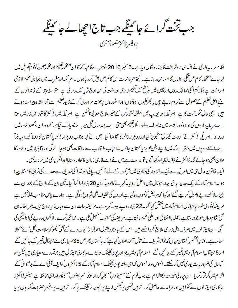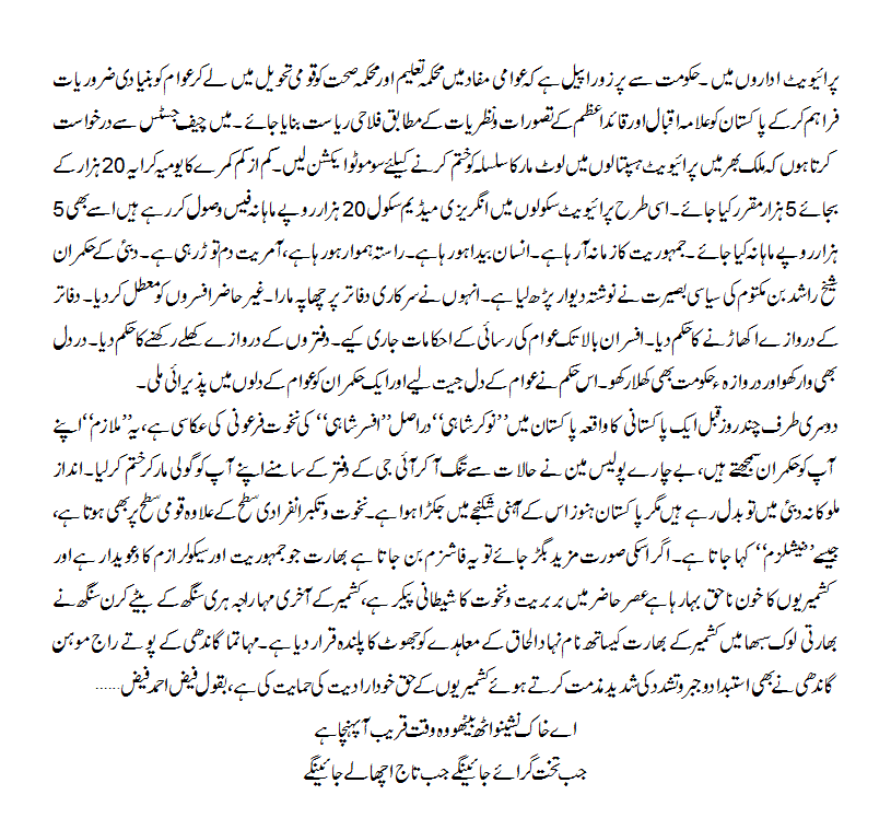 جب تخت گرائے جائینگے جب تاج اچھالے جائینگے By Editor on 10th September 2016 • ( 0 ) جب تخت گرائے جائینگے جب تاج اچھالے جائینگے پروفیسر ڈاکٹر مقصود جعفری Discover more from Voice of East Subscribe to get the latest posts sent to your email. Type your email… Subscribe Share this:Tweet Click to share on Telegram (Opens in new window) Telegram Click to share on Mastodon (Opens in new window) Mastodon Click to share on Bluesky (Opens in new window) Bluesky Click to share on Threads (Opens in new window) Threads Click to share on Reddit (Opens in new window) Reddit Click to share on Nextdoor (Opens in new window) Nextdoor Pocket Click to share on WhatsApp (Opens in new window) WhatsApp Share on Tumblr Click to email a link to a friend (Opens in new window) Email Like Loading...‹ قربانی کی کھالیںپاکستانی سیاست اور صحافت ›Categories: Education, OpinionTags: Pakistan, پاکستان, اسلام Related Articles Urdu Or English? – The Issue Of Language In Pakistan خود بدلتے نہیں قرآں کو بدل دیتے ہیں زبانِ پہلوی کی ہم زبانی ہو نہیں سکتی Right To Education