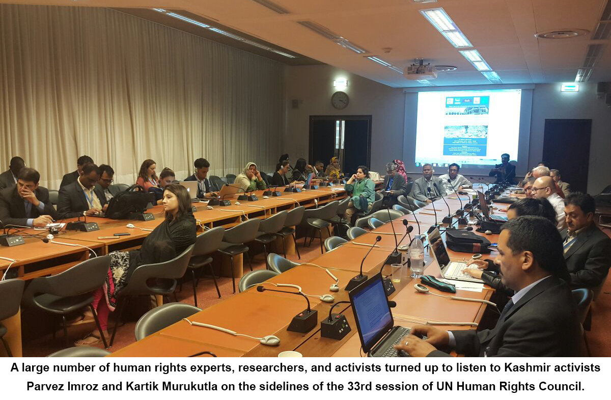 A young Indian lawyer, Kartik Murukutla, also arrived in Geneva and addressed a packed hall of rights experts and activists who are monitoring the recent escalation in Indian-occupied Kashmir. Murukutla, who is not a Kashmiri, has been active in defending the Kashmir freedom movement. He acts as the legal counsel for the JKCCS and is one of the rare Indian civil society voices that speak openly in defense of Kashmiris in India.