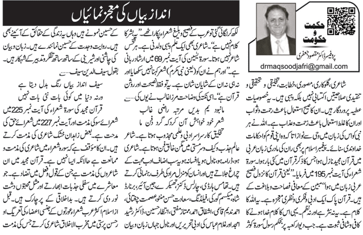 اندازِ بیاں کی معجز نمائیاں By Editor on 18th December 2016 • ( 0 ) اندازِ بیاں کی معجز نمائیاں پروفیسر ڈاکٹر مقصود جعفری Discover more from Voice of East Subscribe to get the latest posts sent to your email. Type your email… Subscribe Share this:Tweet Click to share on Telegram (Opens in new window) Telegram Click to share on Mastodon (Opens in new window) Mastodon Click to share on Bluesky (Opens in new window) Bluesky Click to share on Threads (Opens in new window) Threads Click to share on Reddit (Opens in new window) Reddit Click to share on Nextdoor (Opens in new window) Nextdoor Pocket Click to share on WhatsApp (Opens in new window) WhatsApp Share on Tumblr Click to email a link to a friend (Opens in new window) Email Like Loading...‹ 6 اسلام میں مرد اور عورت کے حقوق و فرائض کا باہمی توازنجھوٹ ہے یہ ›Categories: Islam, PoetryTags: History, Muslims, poets, Quran, قرآن, اسلام Related Articles یاسیدی ﷺ ارحم لنا – امام زین العابدین علیہ السلام كا نعتیہ قصیدہ تبلیغِ دین اور قیامِ دین Spring’s Gift – A Poem For Prophet Muhammad (PBUH) By Shaykh Hamza Yusuf ‘Be Like Ahmad’ ﷺ: A Poem for the Beloved of God by Shaykh Hamza Yusuf