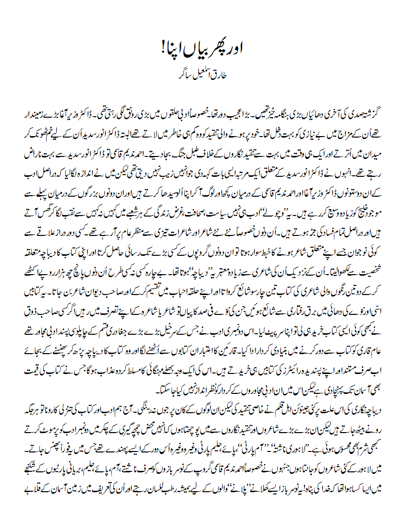 اور پھر بیان اپنا By Editor on 23rd December 2016 • ( 0 ) اور پھر بیان اپنا طارق اسماعیل ساگر Discover more from Voice of East Subscribe to get the latest posts sent to your email. Type your email… Subscribe Share this:Tweet Click to share on Telegram (Opens in new window) Telegram Click to share on Mastodon (Opens in new window) Mastodon Click to share on Bluesky (Opens in new window) Bluesky Click to share on Threads (Opens in new window) Threads Click to share on Reddit (Opens in new window) Reddit Click to share on Nextdoor (Opens in new window) Nextdoor Pocket Click to share on WhatsApp (Opens in new window) WhatsApp Share on Tumblr Click to email a link to a friend (Opens in new window) Email Like Loading...‹ خوارج کی میڈیا فورسPreventive Diplomacy: Successes And Failures ›Categories: Opinion, PoetryTags: Pakistan, پاکستان, پاکستانی ادب, پاکستانی شاعر, پاکستانی صحافت, شاعری, صحافی Related Articles “I Smile At Your Chains” How I Remember Parveen Shakir, An Immortal Poetess On The Extraordinary Poetry And Personality Of Mahmoud Darwish دوست ہوتا نہیں ہر ہاتھ ملانے والا