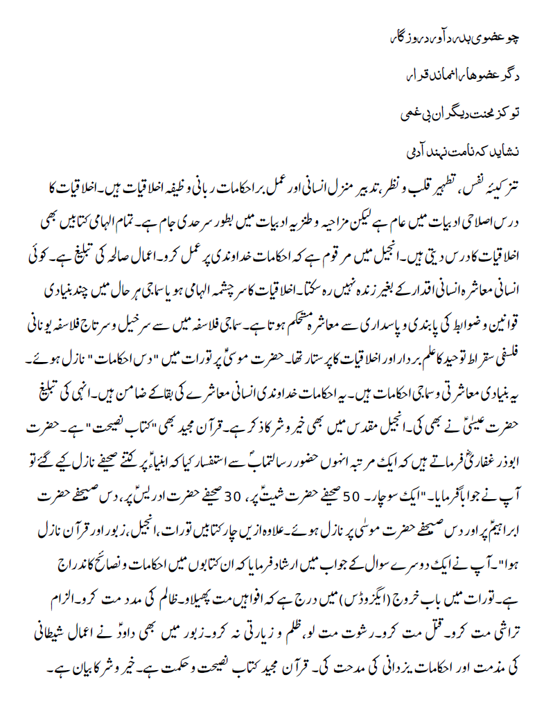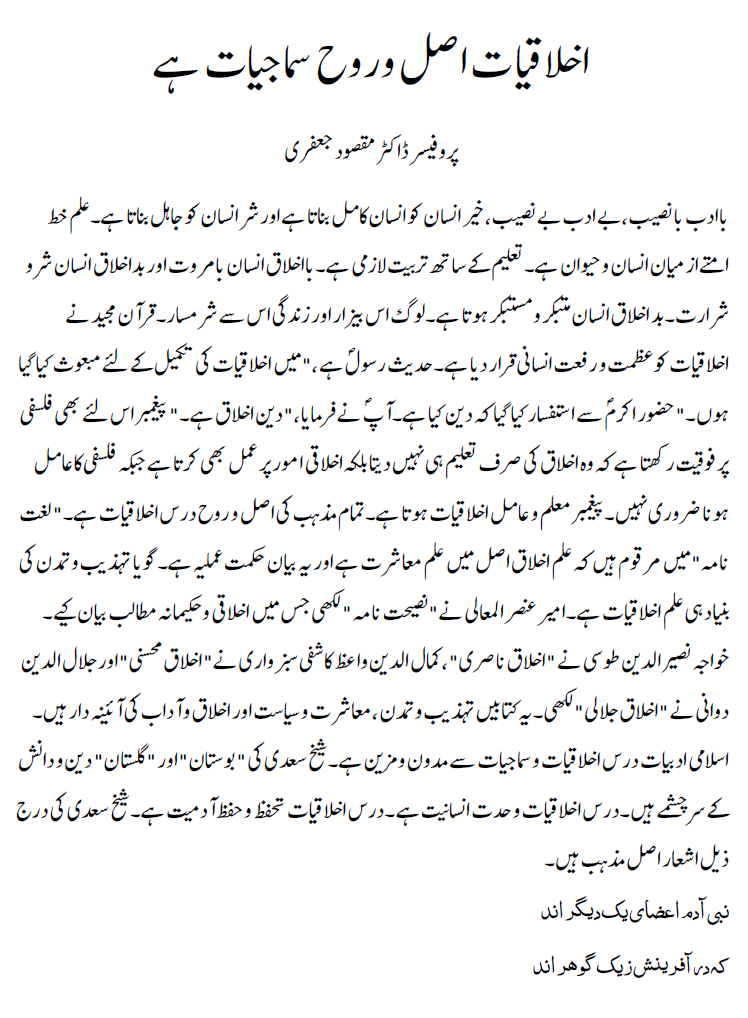 اخلاقیات اصل و روح سماجیات ہے By Editor on 20th May 2017 • ( 0 ) اخلاقیات اصل و روح سماجیات ہے پروفیسر ڈاکٹر مقصود جعفری A crash course on Essentials of HRM Discover more from Voice of East Subscribe to get the latest posts sent to your email. Type your email… Subscribe Share this:Tweet Click to share on Telegram (Opens in new window) Telegram Click to share on Mastodon (Opens in new window) Mastodon Click to share on Bluesky (Opens in new window) Bluesky Click to share on Threads (Opens in new window) Threads Click to share on Reddit (Opens in new window) Reddit Click to share on Nextdoor (Opens in new window) Nextdoor Pocket Click to share on WhatsApp (Opens in new window) WhatsApp Share on Tumblr Click to email a link to a friend (Opens in new window) Email Like Loading...‹ قرآنِ پاک میں انسانیت کو اللہ تعالیٰ کی جانب سے 100 براہِ راست ہدایاتStrategic Importance of Deosai Plains ›Categories: History, OpinionTags: Islam, Muslim Ummah, Muslims, Pakistan, Spirituality, قرآن, مسلمان, پاکستان, اردو, اسلام Related Articles Plutocracy, Aristocracy and Bureaucracy has besieged us اقلیتوں کی دوست یا اقلیتوں کی دشمن؟ Why are Jews persecuted? فیض احمد فیض: سائے اور سراب