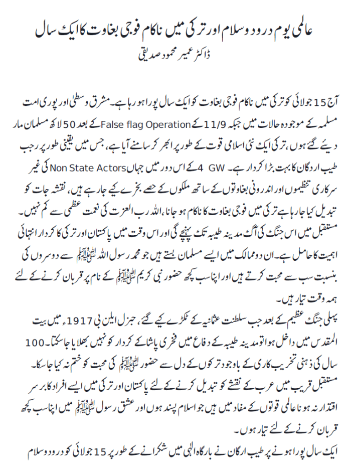 عالمی یوم درود وسلام اور ترکی میں ناکام فوجی بغاوت کا ایک سال