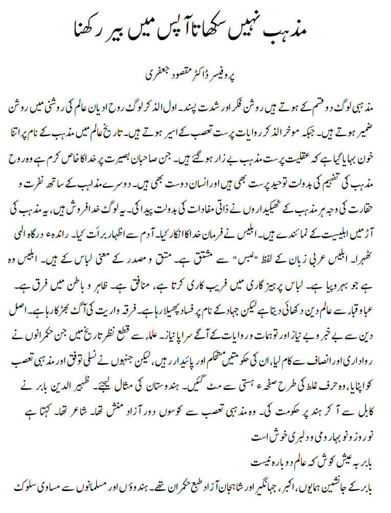 مذہب نہیں سکھاتا آپس میں بیر رکھنا By Editor on 30th July 2017 • ( 0 ) مذہب نہیں سکھاتا آپس میں بیر رکھنا پروفیسر ڈاکٹرمقصود جعفری Discover more from Voice of East Subscribe to get the latest posts sent to your email. Type your email… Subscribe Share this:Tweet Click to share on Telegram (Opens in new window) Telegram Click to share on Mastodon (Opens in new window) Mastodon Click to share on Bluesky (Opens in new window) Bluesky Click to share on Threads (Opens in new window) Threads Click to share on Reddit (Opens in new window) Reddit Click to share on Nextdoor (Opens in new window) Nextdoor Pocket Click to share on WhatsApp (Opens in new window) WhatsApp Share on Tumblr Click to email a link to a friend (Opens in new window) Email Like Loading...‹ زندگی خوشگواربنانے کا گُر سکھانے والی کتابThe Silence of World Powers Gives Sense of Impunity to Indian Forces: Dr. Fai ›Categories: Islam, OpinionTags: History, Muslim Ummah, Muslims, Pakistan, قرآن, مسلمان, پاکستان, اردو, اسلام Related Articles Islamic Theology: Where Faith Meets Reason And Science ابو ظہبی کی لڑکیوں کا رقصِ زُلف The Ignoble Dance Of Tresses By The Girls Of UAE ڈاکٹر ذاکر نائیک کا عقیدہ
