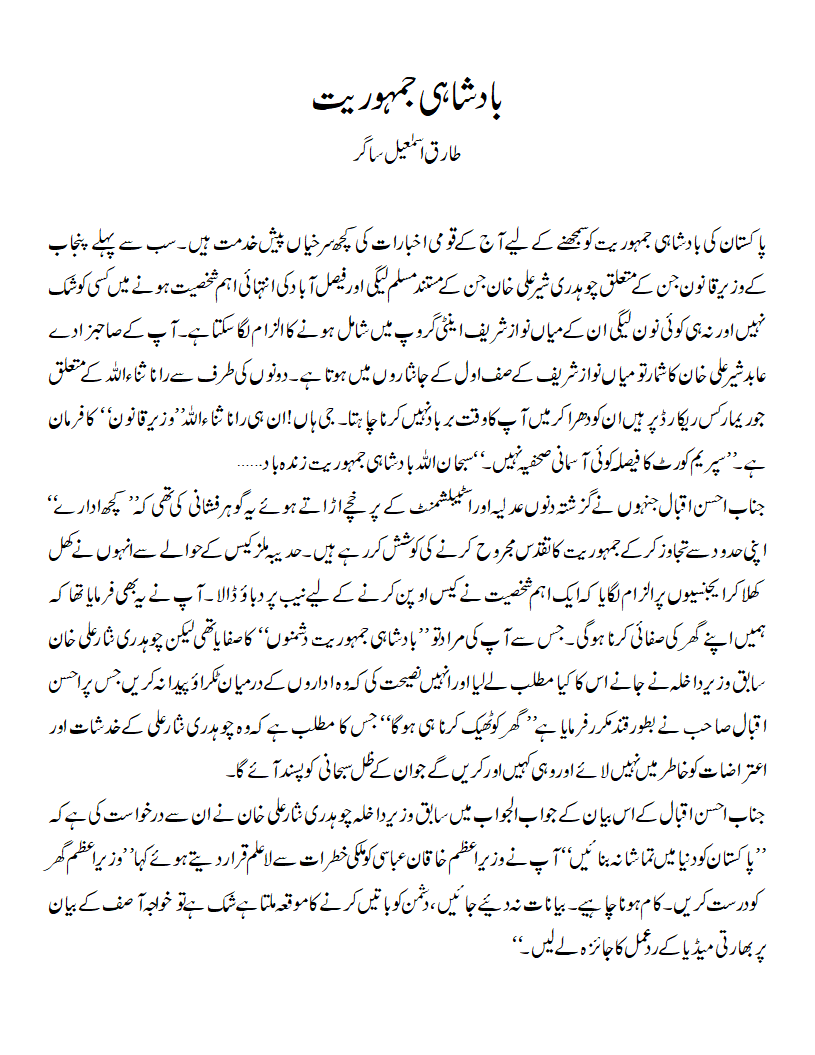 بادشاہی جمہوریت By Editor on 22nd September 2017 • ( 0 ) بادشاہی جمہوریت طارق اسماعیل ساگر Discover more from Voice of East Subscribe to get the latest posts sent to your email. Type your email… Subscribe Share this:Tweet Click to share on Telegram (Opens in new window) Telegram Click to share on Mastodon (Opens in new window) Mastodon Click to share on Bluesky (Opens in new window) Bluesky Click to share on Threads (Opens in new window) Threads Click to share on Reddit (Opens in new window) Reddit Click to share on Nextdoor (Opens in new window) Nextdoor Pocket Click to share on WhatsApp (Opens in new window) WhatsApp Share on Tumblr Click to email a link to a friend (Opens in new window) Email Like Loading...‹ Kashmir Day at Geneva; ‘Azadi’ Slogans Echo at UN“Lay off, Modi!”, people of Balochistan roar with one voice ›Categories: Analysis, Current AffairsTags: current affairs, Democracy, Pakistan, Pakistan Army, PMLN, پاک افواج, پاکستان, اردو Related Articles Analysing Rana Sanaullah’s Speculation That India Wants To Assassinate Imran Khan Was Arshad Sharif Assassinated By Pakistan’s US-Backed Post-Modern Coup Regime? How Bajwa And Co. Pushed Pak Army Into A Corner, But The Rivals Are Dumb And Dumber Interpreting The Pakistani Media Regulator’s Ban On Imran Khan’s Live Broadcasts