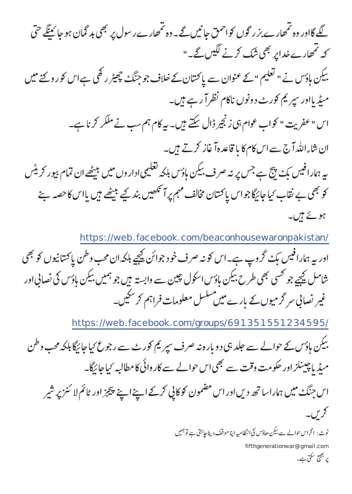 یہ ہمارا فیس بک پیج ہے جس پر نہ صرف بیکن ہاؤس بلکہ تعلیمی اداروں میں بیٹھے ان تمام بیورکریٹس کو بھی بے نقاب کیا جائیگا جو اس پاکستان مخالف مہم پر آنکھیں بند کیے بیٹھے ہیں یا اس کا حصہ بنے ہوئے ہیں۔
