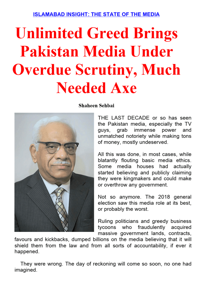 Pakistan media under overdue scrutiny, much needed axe By Editor on 29th January 2019 • ( 0 ) By Shaheen Sehbai Discover more from Voice of East Subscribe to get the latest posts sent to your email. Type your email… Subscribe Share this:Tweet Click to share on Telegram (Opens in new window) Telegram Click to share on Mastodon (Opens in new window) Mastodon Click to share on Bluesky (Opens in new window) Bluesky Click to share on Threads (Opens in new window) Threads Click to share on Reddit (Opens in new window) Reddit Click to share on Nextdoor (Opens in new window) Nextdoor Pocket Click to share on WhatsApp (Opens in new window) WhatsApp Share on Tumblr Click to email a link to a friend (Opens in new window) Email Like Loading...‹ گستاخی کے لیے شرعی عدالتجناح کی آواز ›Categories: Analysis, Current AffairsTags: Democracy, Geopolitics, Pakistan, Pakistan Media, Shaheen Sehbai Related Articles Analysing Rana Sanaullah’s Speculation That India Wants To Assassinate Imran Khan Was Arshad Sharif Assassinated By Pakistan’s US-Backed Post-Modern Coup Regime? How Bajwa And Co. Pushed Pak Army Into A Corner, But The Rivals Are Dumb And Dumber Interpreting The Pakistani Media Regulator’s Ban On Imran Khan’s Live Broadcasts