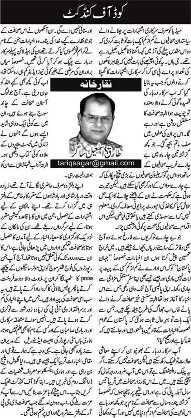 کوڈ آف کنڈکٹ By Editor on 31st January 2019 • ( 0 ) کوڈ آف کنڈکٹ طارق اسماعیل ساگر Discover more from Voice of East Subscribe to get the latest posts sent to your email. Type your email… Subscribe Share this:Tweet Click to share on Telegram (Opens in new window) Telegram Click to share on Mastodon (Opens in new window) Mastodon Click to share on Bluesky (Opens in new window) Bluesky Click to share on Threads (Opens in new window) Threads Click to share on Reddit (Opens in new window) Reddit Click to share on Nextdoor (Opens in new window) Nextdoor Pocket Click to share on WhatsApp (Opens in new window) WhatsApp Share on Tumblr Click to email a link to a friend (Opens in new window) Email Like Loading...‹ جناح کی آوازاقبال کا خواب ›Categories: Analysis, Current Affairs Related Articles Analysing Rana Sanaullah’s Speculation That India Wants To Assassinate Imran Khan Was Arshad Sharif Assassinated By Pakistan’s US-Backed Post-Modern Coup Regime? How Bajwa And Co. Pushed Pak Army Into A Corner, But The Rivals Are Dumb And Dumber Interpreting The Pakistani Media Regulator’s Ban On Imran Khan’s Live Broadcasts