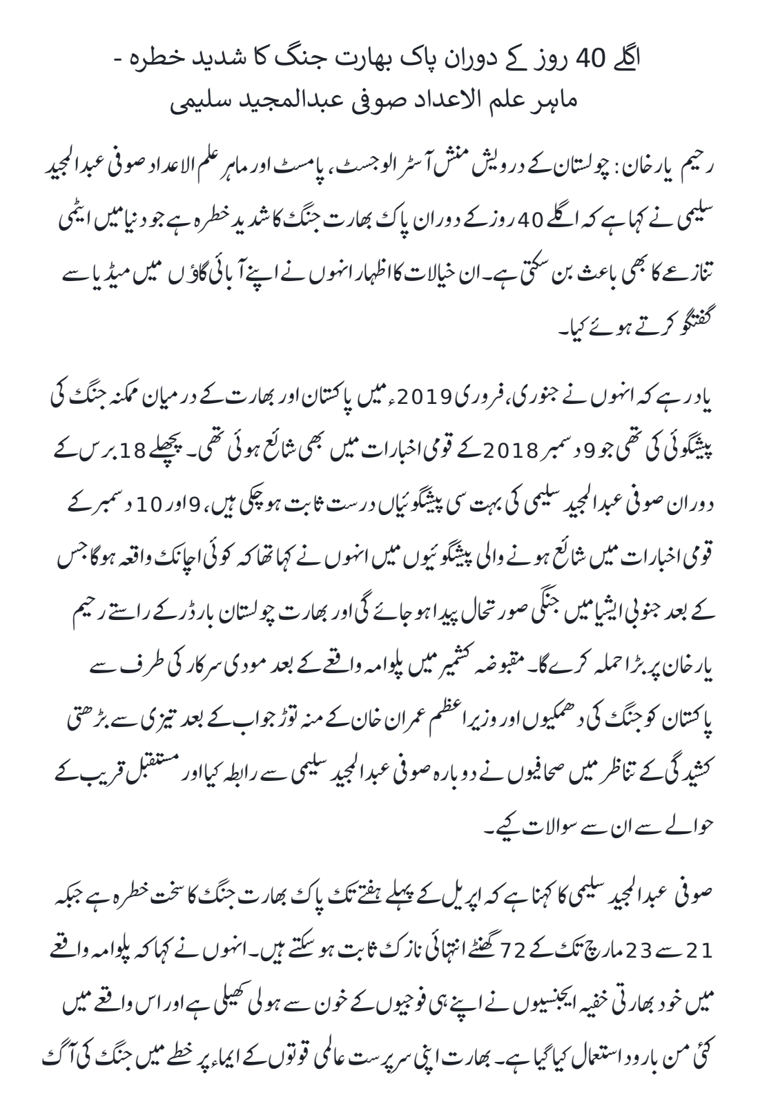 اگلے 40 روز کے دوران پاک بھارت جنگ کا شدید خطرہ