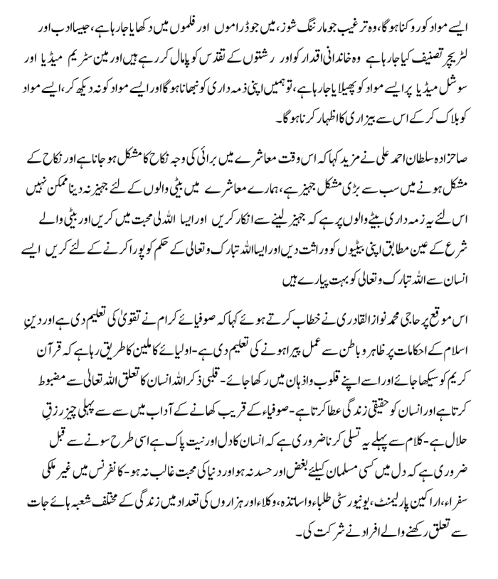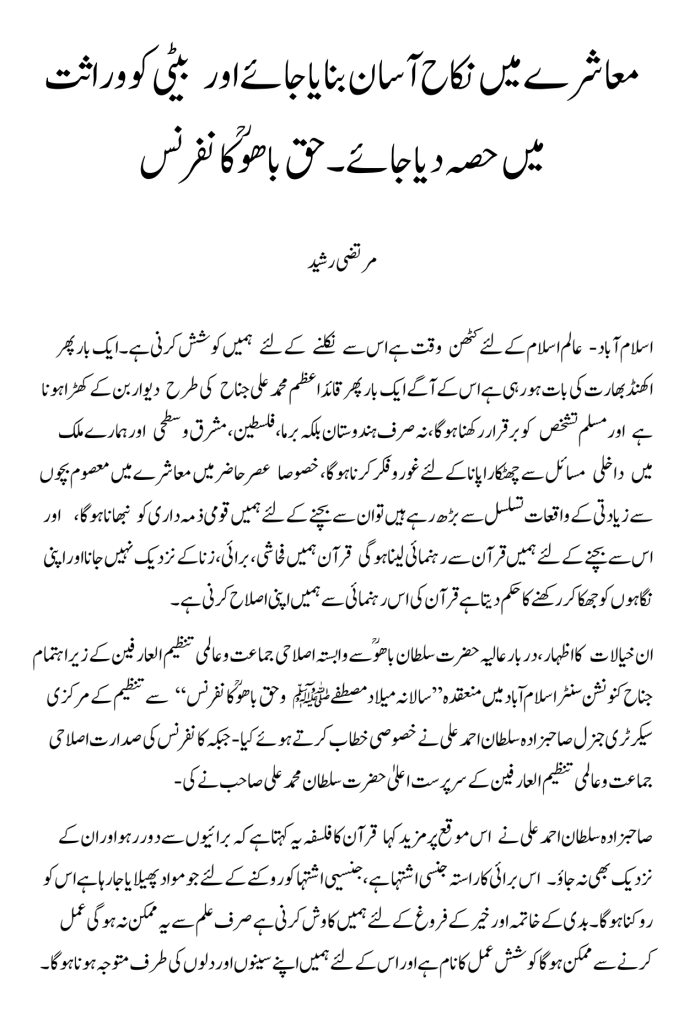 معاشرے میں نکاح آسان بنایا جائےاور بیٹی کو وراثت میں حصہ دیا جائے۔حق باھوؒ کانفرنس