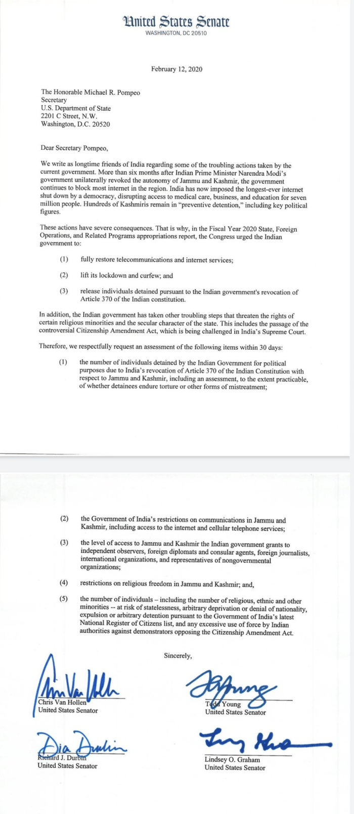 Four top US Senators, including Republican Lindsey Graham, who is close to Trump, Chris Van Hollen, Todd Young and Richard J. Durbin wrote to the US Secretary of State expressing concern about political detentions, internet curbs in Kashmir, saying this has “severe consequences”.