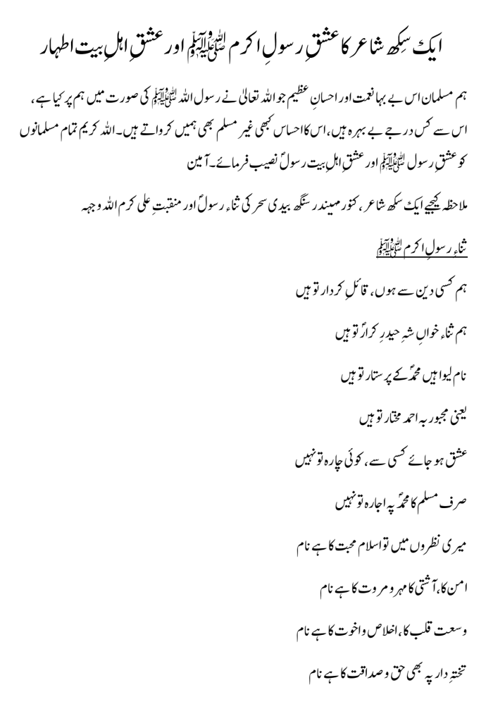 ایک سِکھ شاعر کا عشقِ رسولِ اکرم ﷺ اورعشقِ اہلِ بیت اطہار