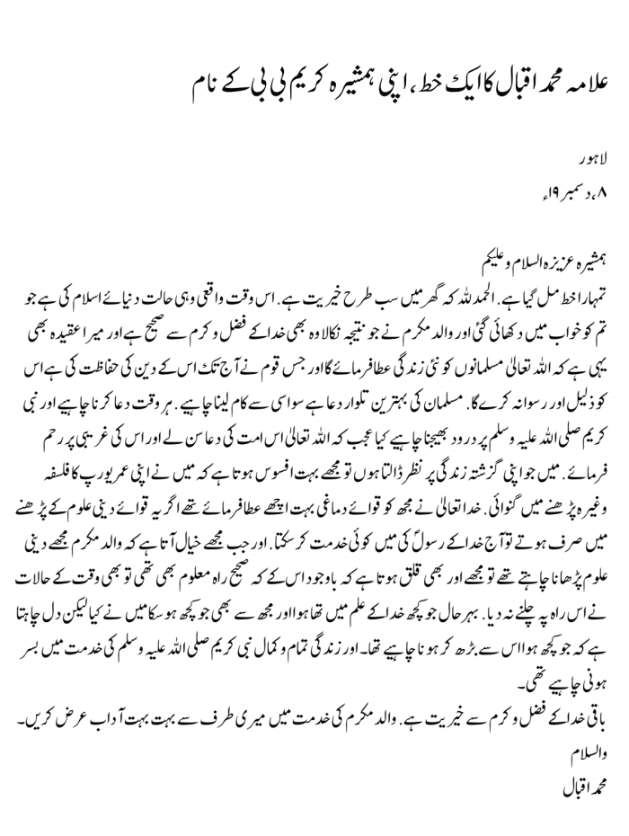 علامہ محمد اقبال کا ایک خط، اپنی ہمشیرہ کریم بی بی کے نام