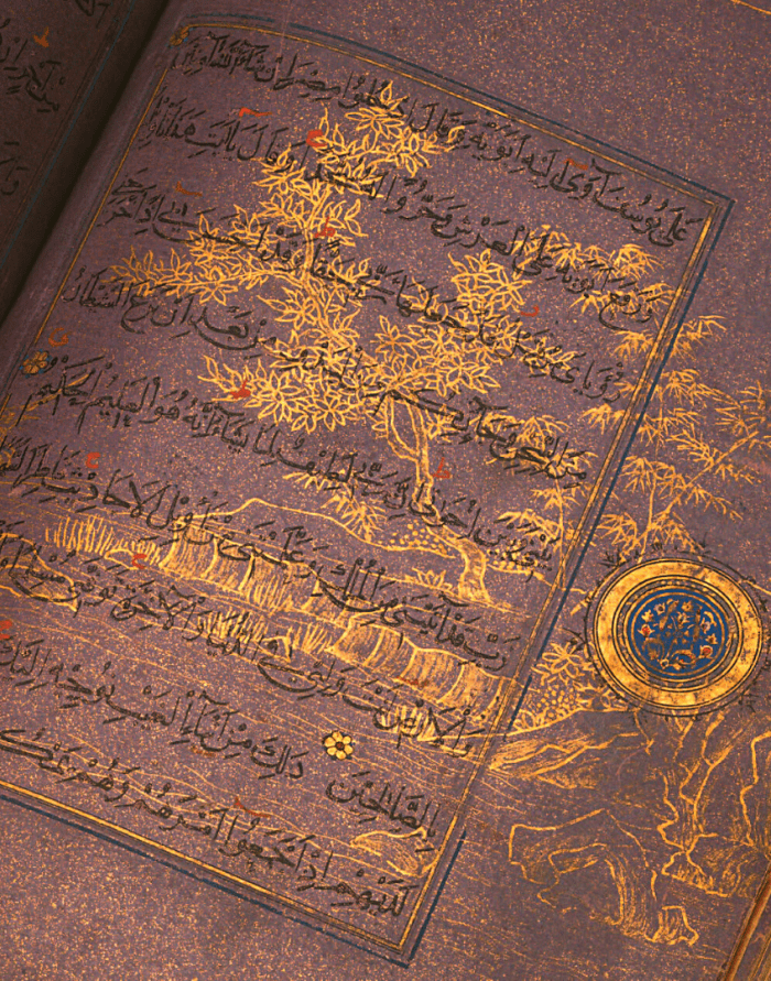 Many pages in this Qur’an are decorated with either gold speckles or characteristically Chinese motifs such as naturalistic details of plants like peach blossoms, architecture & landscapes. These designs resonate with the patterns seen on Ming silks and blue and white porcelain.