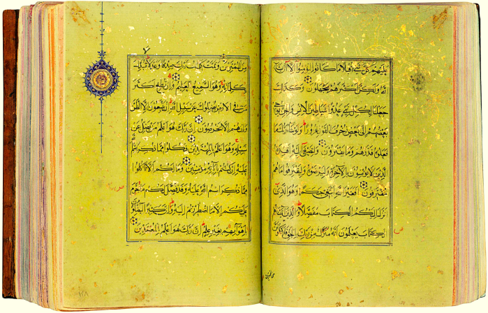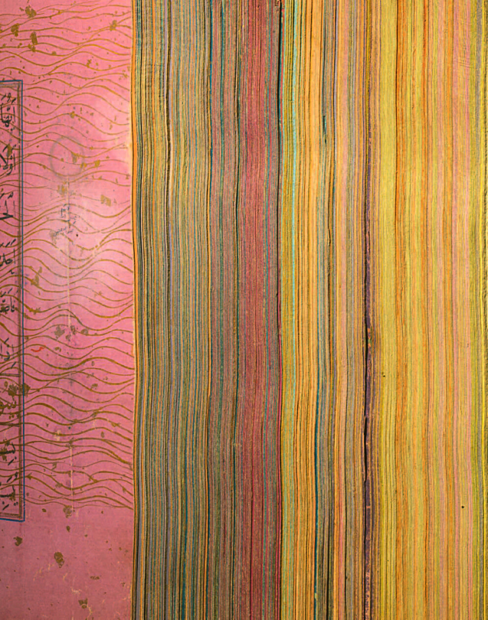 The exact formula with which the paper was permeated and dyed is still not fully known. It was not just its velvety texture that made the paper desirable but also its range of colours, which were extensive and in this Qur’an include shades of blue, pink, lavender, yellow & green.