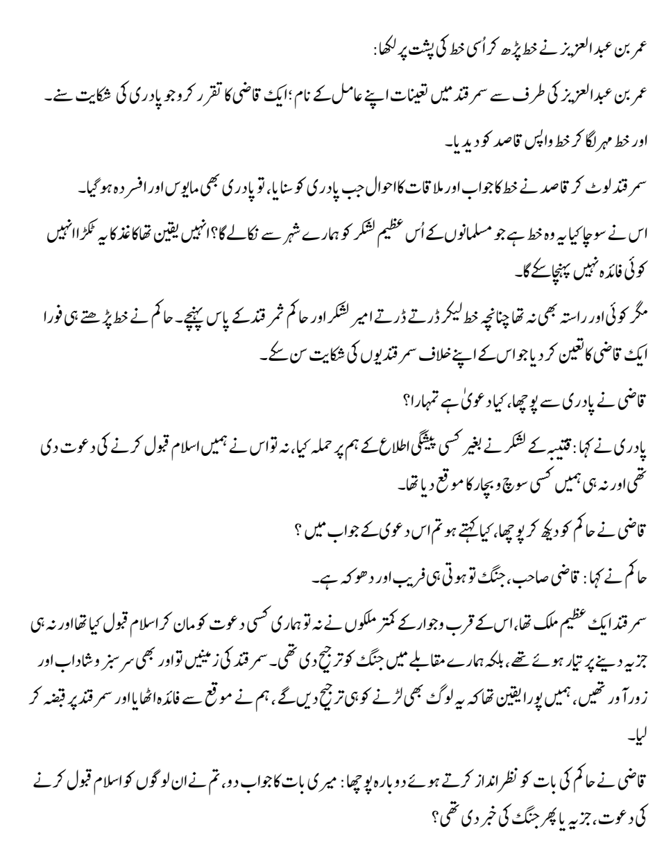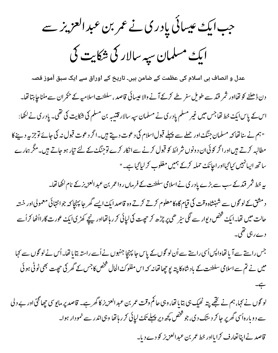 جب ایك عیسائی پادری نے عمر بن عبد العزیز سےایک مسلمان سپہ سالار كی شكایت كی