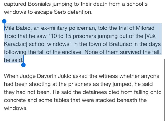 Many men began to leave the forests and surrender after realizing they had no escape. One such man was Ramo Osmanovic, who was then forced by Serb Soldiers to call his son, Nermin, into surrender. Both father and son were executed: