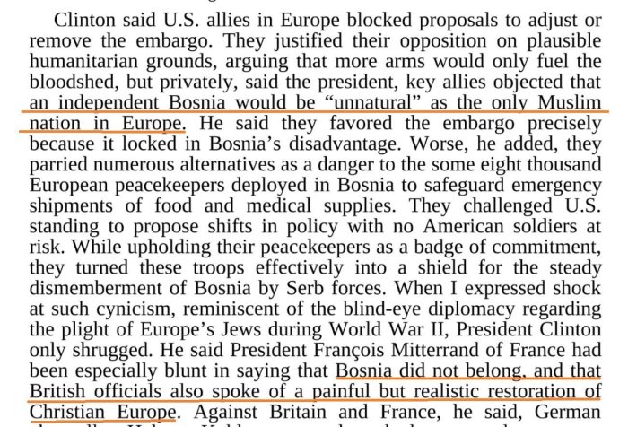 Despite the outcry of Bosnian politicians, the UN refused to lift the embargo. France stated how Bosnia did not belong in Europe, and British officials called massacres against a defenceless Muslim population “a painful but realistic restoration of Christian Europe”