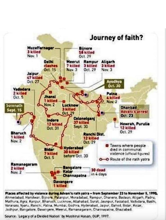 7. In 1992, Babri Masjid was demolished by 150,000 kar sevaks. It was planned 10 months in advance by leaders of RSS, BJP and VHP in collusion with PM Rao’s govt. No RSS leaders were imprisoned after the demolition. The RSS was apparently banned but shakhas were never closed.