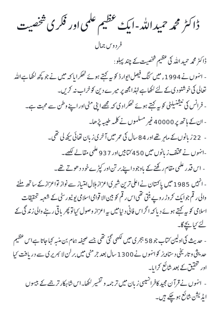 ڈاکٹر محمد حمیداللہ – ایک عظیم علمی اور فکری شخصیت