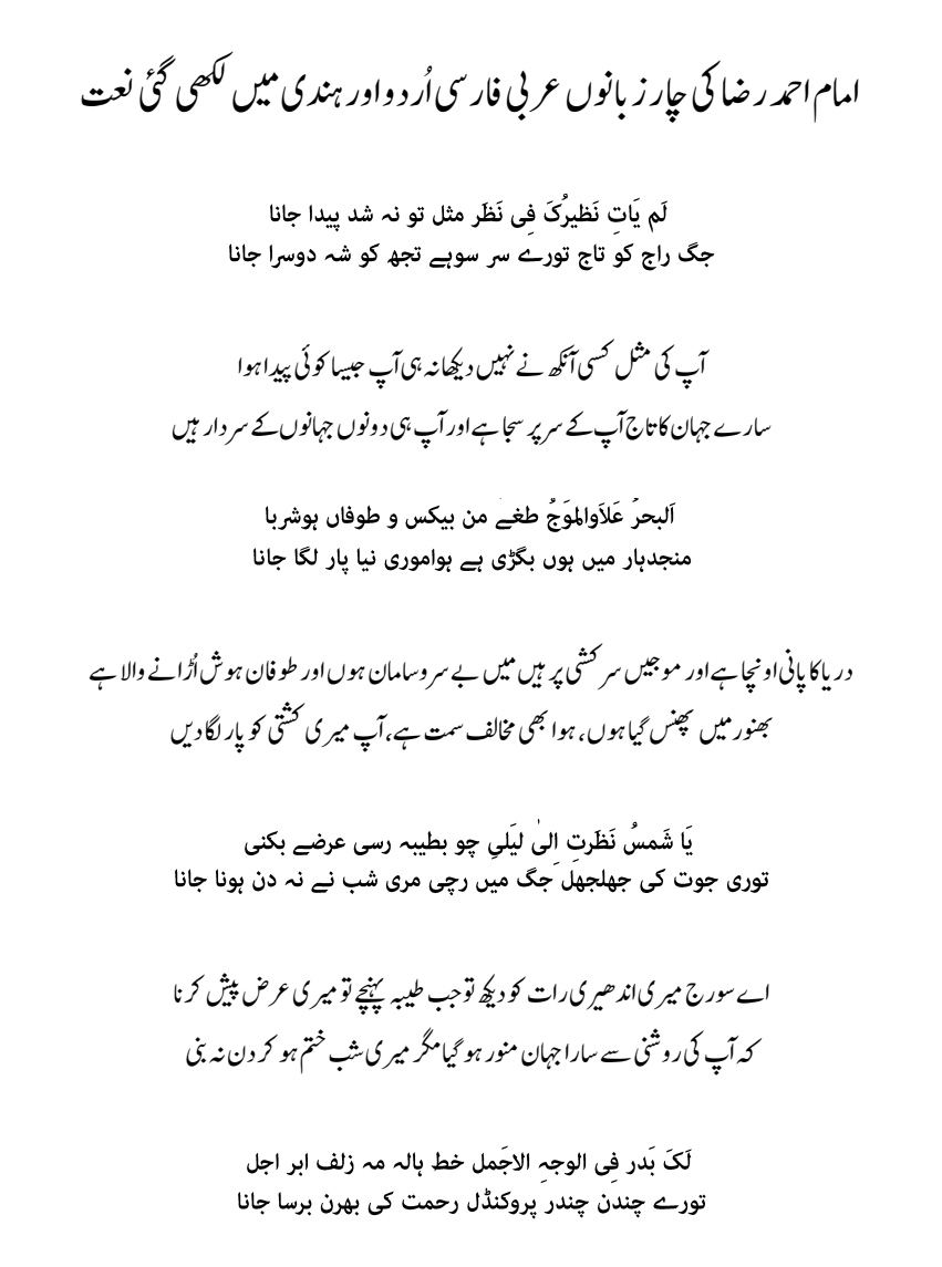 امام احمد رضا کی چار زبانوں عربی فارسی اُردو اورہندی میں لکھی گئی نعت