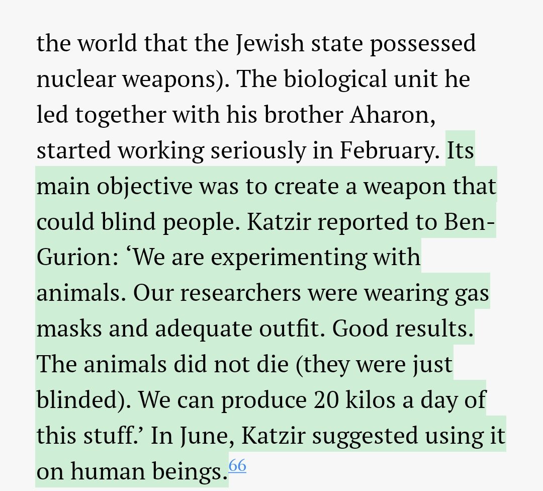 Ben Gurion arranged a lethal weapon that was be used to set fire to the fields and houses of Palestinians: a flame-thrower. This project was part of a larger unit engaged in developing biological warfare under directorship of Ephraim Katzir who later became the Israeli President.