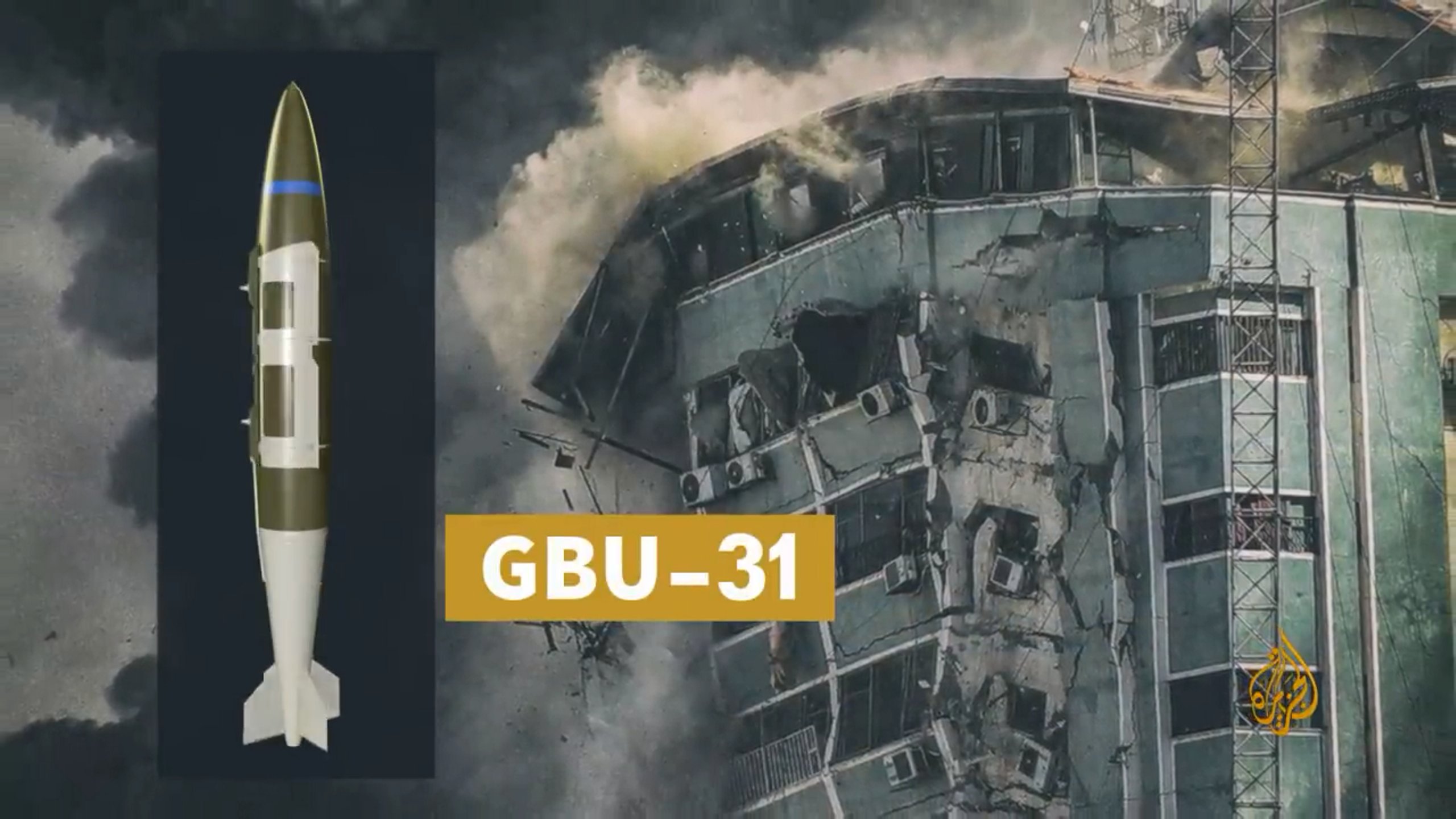 The bomb Israel used to bring down Al-Jalaa tower (with AP and Al Jazeera English offices) is a US Made GBU-31 bomb that weighs 907KG.