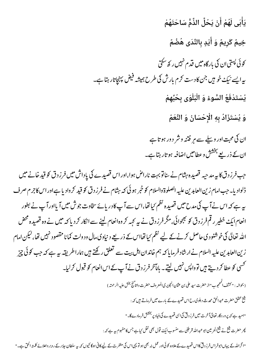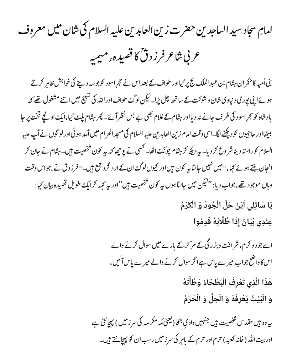 امامِ سجاد سید الساجدین حضرت زین العابدین علیہ السلام کی شان میں معروف عربی شاعر فرزدقؒ کا قصیدہء میمیہ