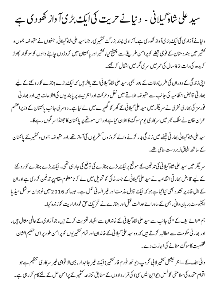 سید علی شاہ گیلانی ۔ دنیا نے حریت کی ایک بڑی آواز کھو دی ہے