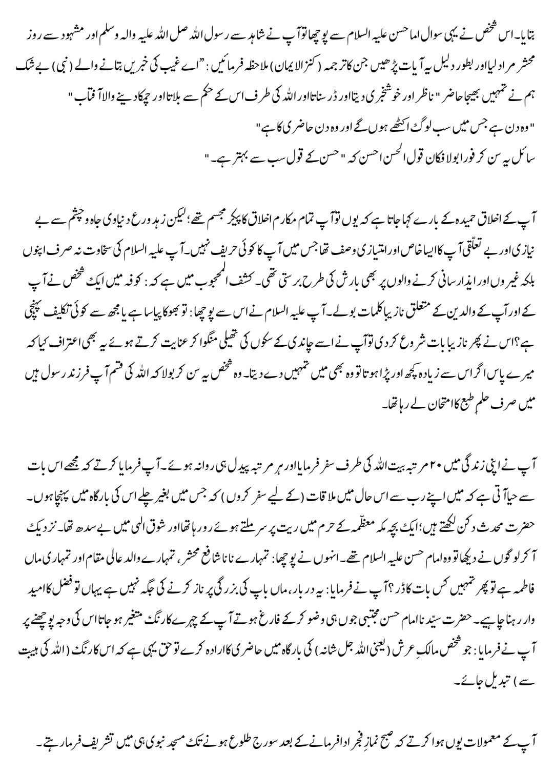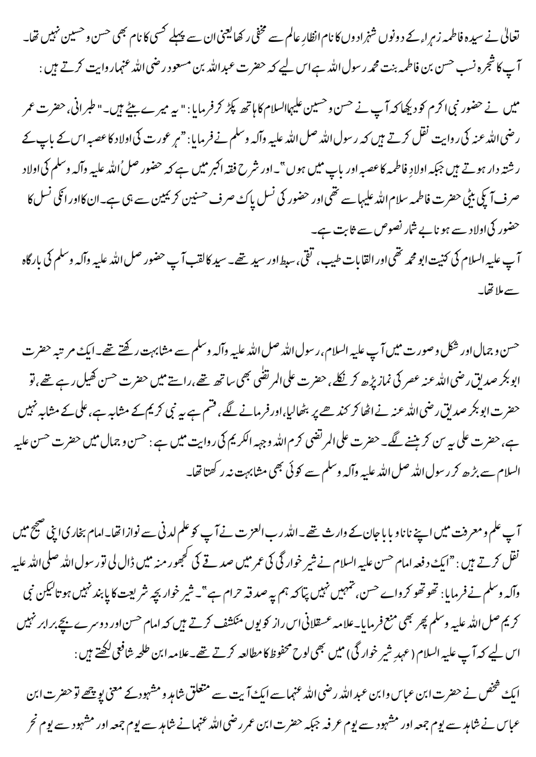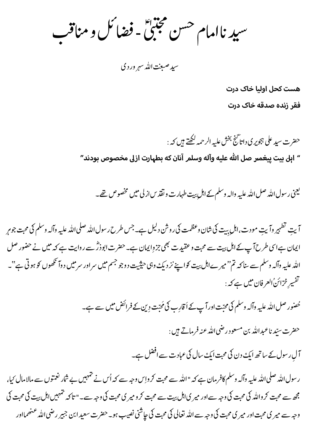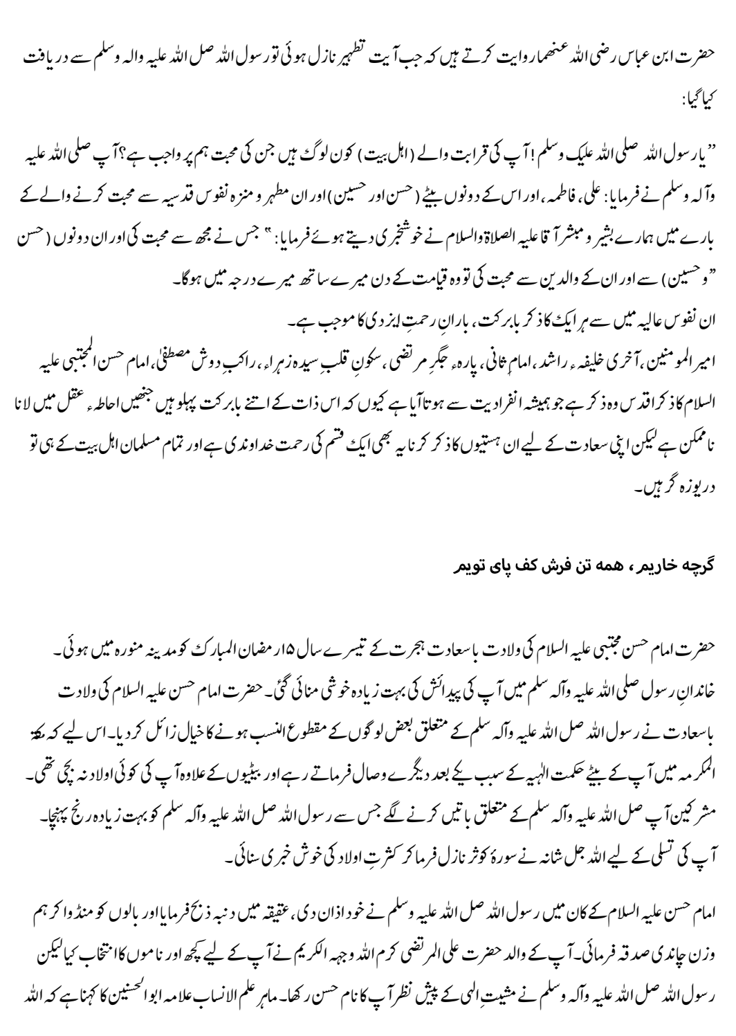 سیدنا امام حسن مجتبیٰ ؑ – فضائل و مناقب By Editor on 6th October 2021 • ( 1 ) سیدنا امام حسن مجتبیٰ ؑ – فضائل و مناقب سید صبغت اللہ سہروردی بشکریہ روزنامہ 92 نیوز Discover more from Voice of East Subscribe to get the latest posts sent to your email. Type your email… Subscribe Share this:Tweet Click to share on Telegram (Opens in new window) Telegram Click to share on Mastodon (Opens in new window) Mastodon Click to share on Bluesky (Opens in new window) Bluesky Click to share on Threads (Opens in new window) Threads Click to share on Reddit (Opens in new window) Reddit Click to share on Nextdoor (Opens in new window) Nextdoor Pocket Click to share on WhatsApp (Opens in new window) WhatsApp Share on Tumblr Click to email a link to a friend (Opens in new window) Email Like Loading...‹ Seminar At Tysons Corner: UN Urged To Help Resolve Kashmir DisputeSustainable Agriculture Prospects In Pakistan And Food Security ›Categories: Ahlulbayt, History, IslamTags: Ahlebayt, Ahlulbayt, History, Imam Hassan, Islam, ٰامام حسن, اہل بیت, اردو, اسلام Related Articles نواسیِ رسولؐ حضرت زینب سلام اللہ علیہا کے فضائل و مناقب فضائل و مناقب نواسہِ رسول، حضرت امام حسن المجتبیٰ عليہ السلام امام حسین علیہ السلام كا چہلم: خون سے لکھی ہوئی تاریخ Commemorating Arbaeen, And The Purpose Of Imam Hussain’s Martyrdom