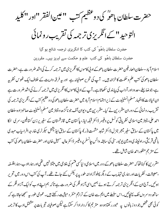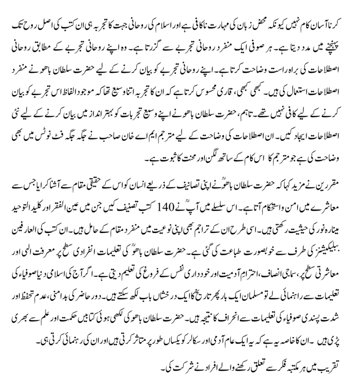 حضرت سلطان باھُو ؒ کی دو عظیم کتب “عین الفقر”اور “کلید التوحید “کے انگریزی ترجمہ کی تقریب رونمائی