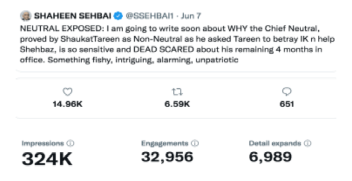 Washington – I tweeted on June 7 that I was in the process of writing a piece on “Why the Chief Neutral, proved by Shaukat Tareen as Non-Neutral as he asked Tareen to betray Imran Khan and help Shehbaz, is so sensitive and dead scared about his remaining four months in office. Something fishy, intriguing, alarming, unpatriotic.”