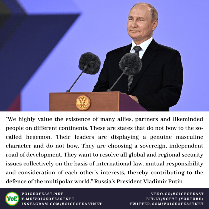 The first part that attracts attention is the Russian leader’s explicit reference to the emerging multipolar world, which aligns with the global revolutionary manifesto that he unveiled late last month for inspiring the BRICS-led Global South to rise up against the neo-colonial yoke of the US-led West’s Golden Billion. The second aspect worthy of note is the acknowledgement that many countries on different continents share the spirit of his worldview, to which end their leaders are embracing the trend that President Putin spoke about earlier this summer connected to the rise of truly sovereign states, which constitutes the third point.