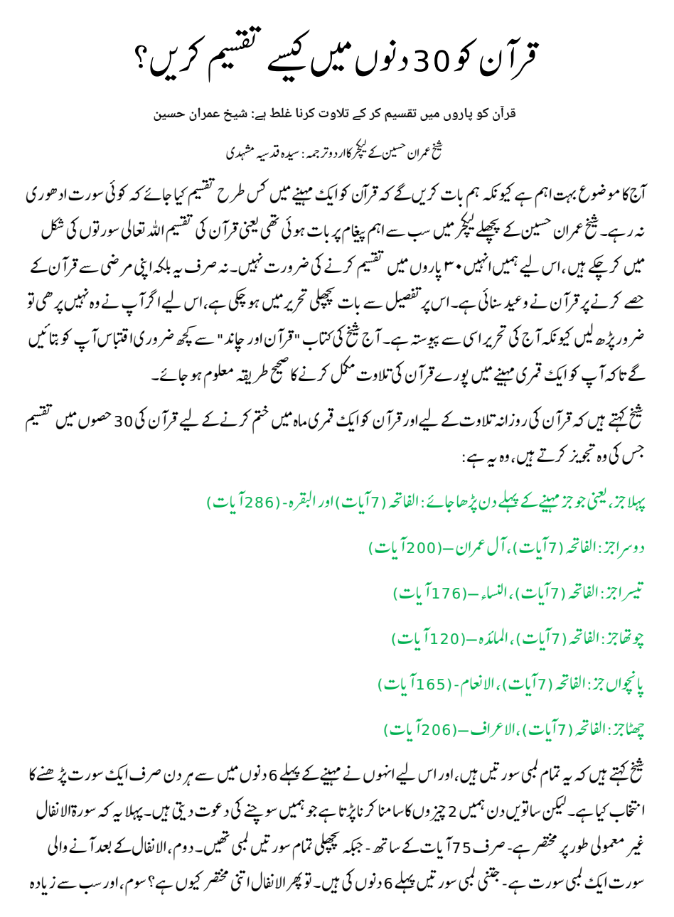 قرآن کو 30 دنوں میں كیسے تقسیم كریں؟ – شیخ عمران حسین