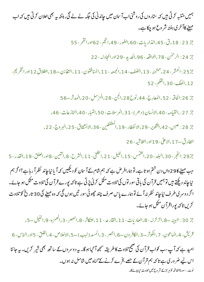 قرآن کی تلاوت کا صحیح طریقہ اور سورتوں کی ایک ماہ میں صحیح تقسیم کا گریفک یہاں سے ڈاون لوڈ کریں