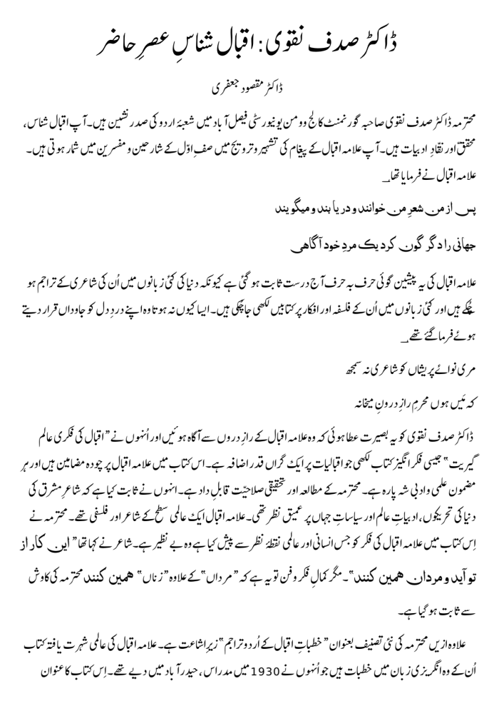 ڈاکٹر صدف نقوی: اقبال شناسِ عصرِ حاضر