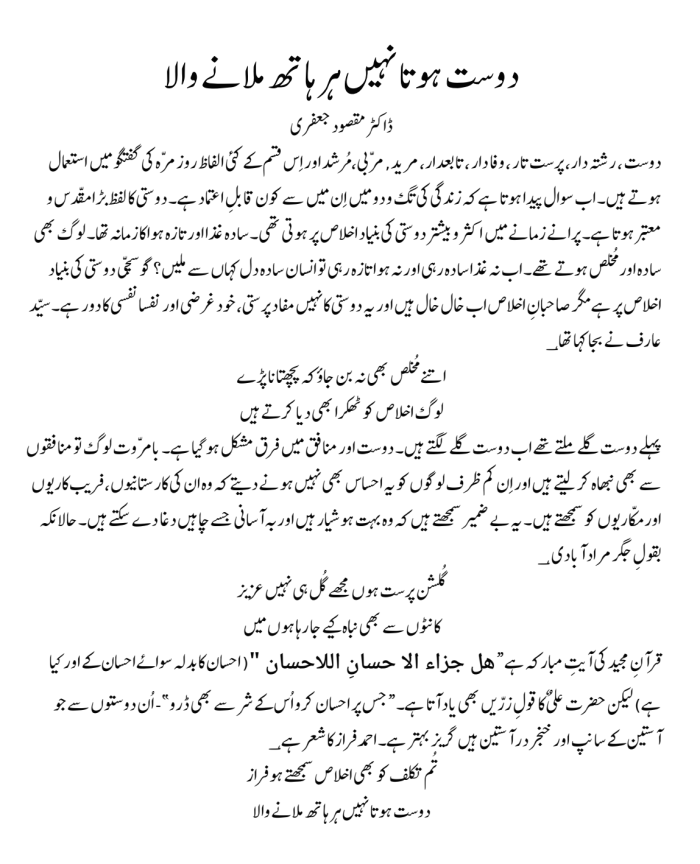 دوست ہوتا نہیں ہر ہاتھ ملانے والا By Editor on 20th October 2023 • ( 0 ) دوست ہوتا نہیں ہر ہاتھ ملانے والا ڈاکٹر مقصود جعفری Discover more from Voice of East Subscribe to get the latest posts sent to your email. Type your email… Subscribe Share this:Tweet Click to share on Telegram (Opens in new window) Telegram Click to share on Mastodon (Opens in new window) Mastodon Click to share on Bluesky (Opens in new window) Bluesky Click to share on Threads (Opens in new window) Threads Click to share on Reddit (Opens in new window) Reddit Click to share on Nextdoor (Opens in new window) Nextdoor Pocket Click to share on WhatsApp (Opens in new window) WhatsApp Share on Tumblr Click to email a link to a friend (Opens in new window) Email Like Loading...‹ Liberal Democracy Has Deep-Rooted Totalitarian Traits – Alexander DuginThe West’s Double Standards Towards Israel And Ukraine Discredited It In The Global South ›Categories: Opinion, PoetryTags: Urdu, مسلمان, پاکستان, اردو, اسلام, شاعری Related Articles “I Smile At Your Chains” How I Remember Parveen Shakir, An Immortal Poetess On The Extraordinary Poetry And Personality Of Mahmoud Darwish On the Need of Existential Spirituality