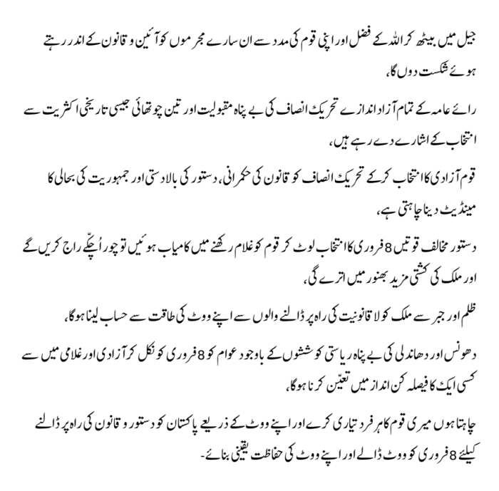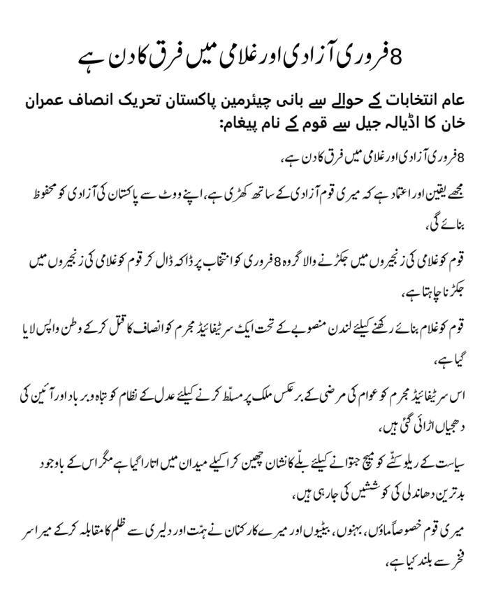 عام انتخابات کے حوالے سے بانی چیئرمین پاکستان تحریک انصاف عمران خان کا اڈیالہ جیل سے قوم کے نام پیغام