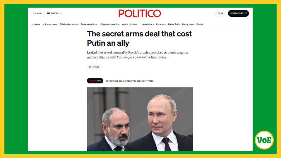 Politico published a piece last week dramatically titled “The secret arms deal that cost Putin an ally”, which concocts the story that the supposedly real reason why Armenia wants to ditch the CSTO is because treaty ally Belarus earlier sold weapons to Azerbaijan, not due to any Western games. According to them, “a cache of more than a dozen letters, diplomatic notes, bills of sale and export passports seen by POLITICO shows that Belarus actively aided Azerbaijan’s armed forces between 2018 and 2022”.