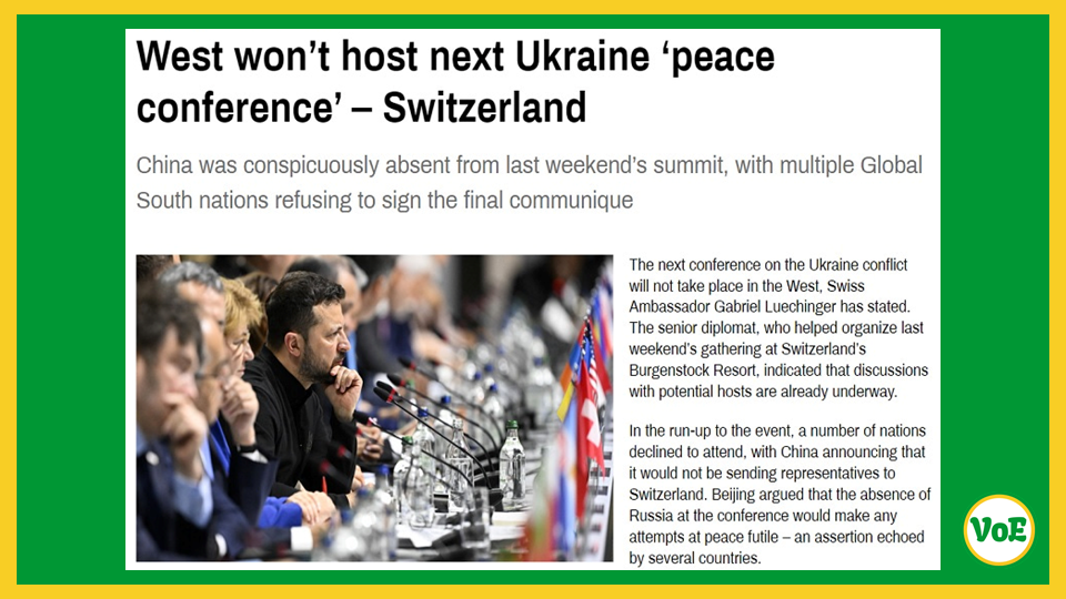 Swiss Ambassador Gabriel Luechinger acknowledged that last weekend’s talks that he helped organize were insufficient for bringing peace to Ukraine and that the next ones will therefore be much more different. In his words, “What is clear is that the next peace summit will not be in Europe, and will not take place in the West”, and “Russia should be integrated in the peace process in some way.” This sensible stance is long-overdue and was brought about by the confluence of three key factors.
