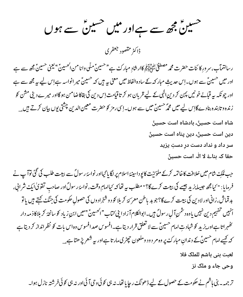 “حسینؑ مجھ سے ہے اور میں حسینؑ سے ہوں” By Editor on 14th July 2024 • ( 0 ) “حسینؑ مجھ سے ہے اور میں حسینؑ سے ہوں” پروفیسر ڈاکٹر مقصود جعفری Discover more from Voice of East Subscribe to get the latest posts sent to your email. Type your email… Subscribe Share this:Tweet Click to share on Telegram (Opens in new window) Telegram Click to share on Mastodon (Opens in new window) Mastodon Click to share on Bluesky (Opens in new window) Bluesky Click to share on Threads (Opens in new window) Threads Click to share on Reddit (Opens in new window) Reddit Click to share on Nextdoor (Opens in new window) Nextdoor Pocket Click to share on WhatsApp (Opens in new window) WhatsApp Share on Tumblr Click to email a link to a friend (Opens in new window) Email Like Loading...‹ The Quran, Gaza’s Genocide and Russia’s Destiny – Sheikh Imran N. Hosein The US Found A Clever Way To Pressure The EU Into Decoupling From China ›Categories: Ahlulbayt, History, Ideology, IslamTags: Ahlebayt, Ahlulbayt, History, Imam Hussain, Islam, اہل بیت, اسلام Related Articles فضائل و مناقب نواسہِ رسول، حضرت امام حسن المجتبیٰ عليہ السلام Commemorating Arbaeen, And The Purpose Of Imam Hussain’s Martyrdom “میں حُر ہوں اور لشکرِ یزید میں ہوں” شبِ عاشور امام عالی مقام حضرت حسین علیہ السلام کا اپنے احباب سے خطاب اور ان کے جوابات