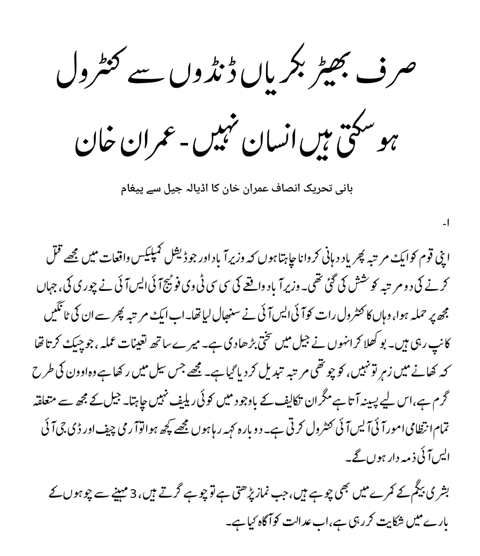 بانی تحریک انصاف عمران خان کا اڈیالہ جیل سے پیغام